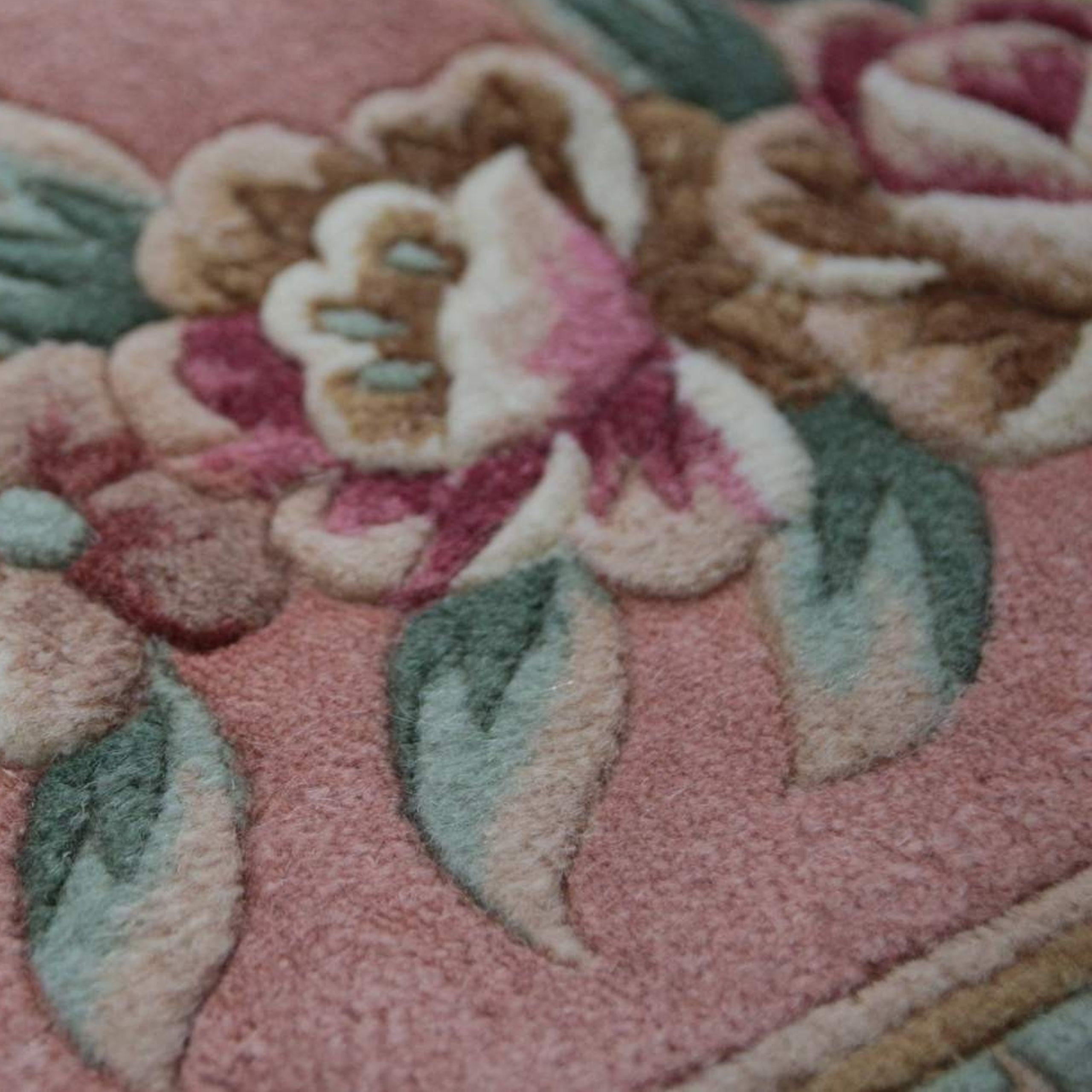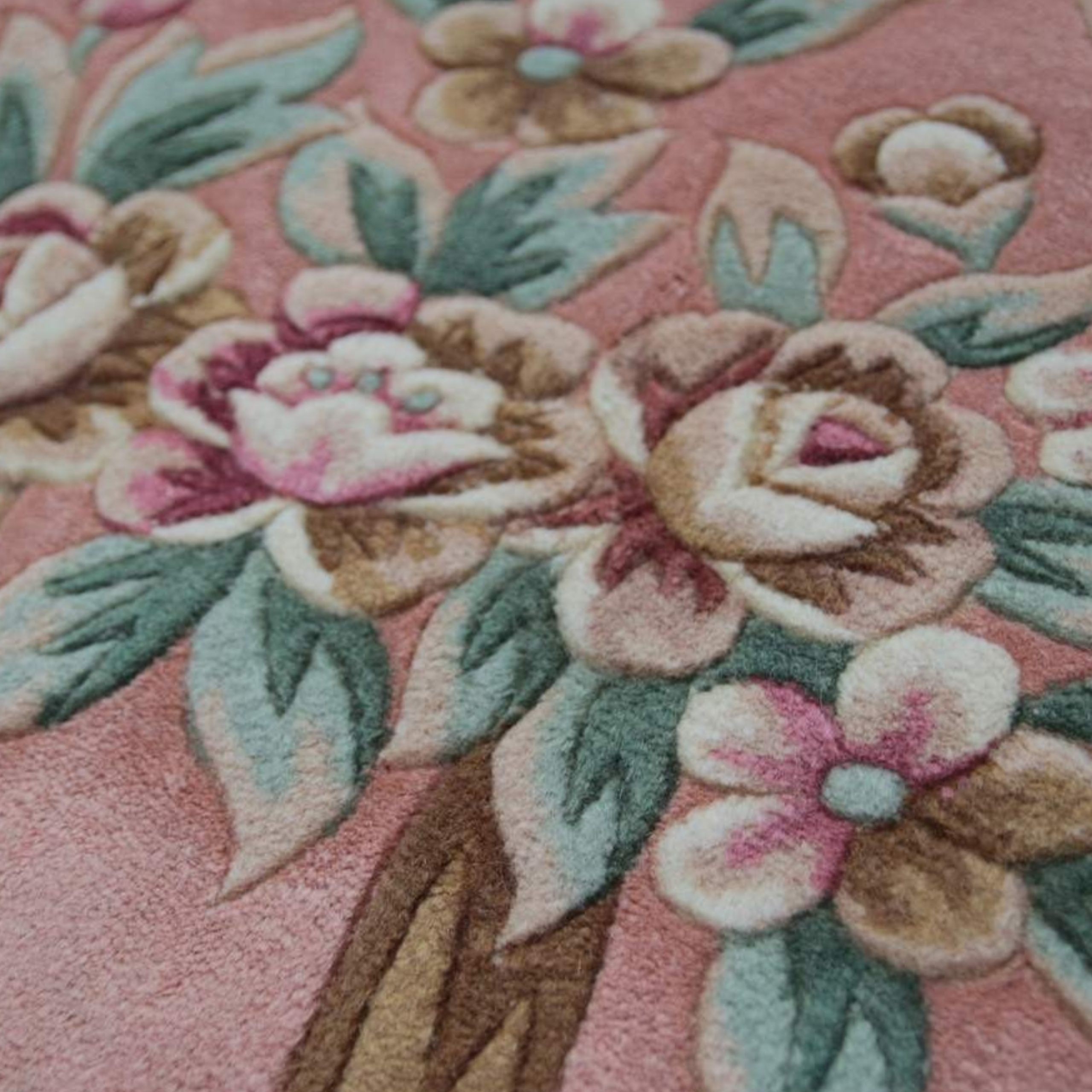 Dywan ma bardzo grube i wytrzymałe runo. Wzór kwiatowy jest ręcznie przycinany - reliefowany na różnych poziomach. Dywan jest bardzo gęsto utkany z rewelacyjnie miękkiej wełny wysokiej jakości. Jest to prawdziwe dzieło sztuki.